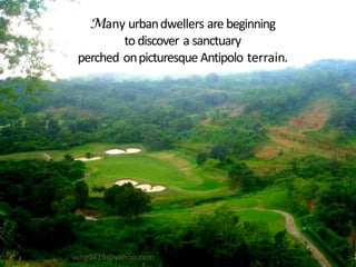 Sun Valley Residential Estates is a serene and nature-friendly community located in Antipolo, offering a range of residential options and amenities including an 18-hole golf course, various recreational facilities, and prime residential lots. The location provides easy access to major commercial establishments while promoting a relaxed lifestyle away from urban congestion. The development features a variety of home models designed for comfort and modern living, set against the backdrop of lush greenery and mountain views.