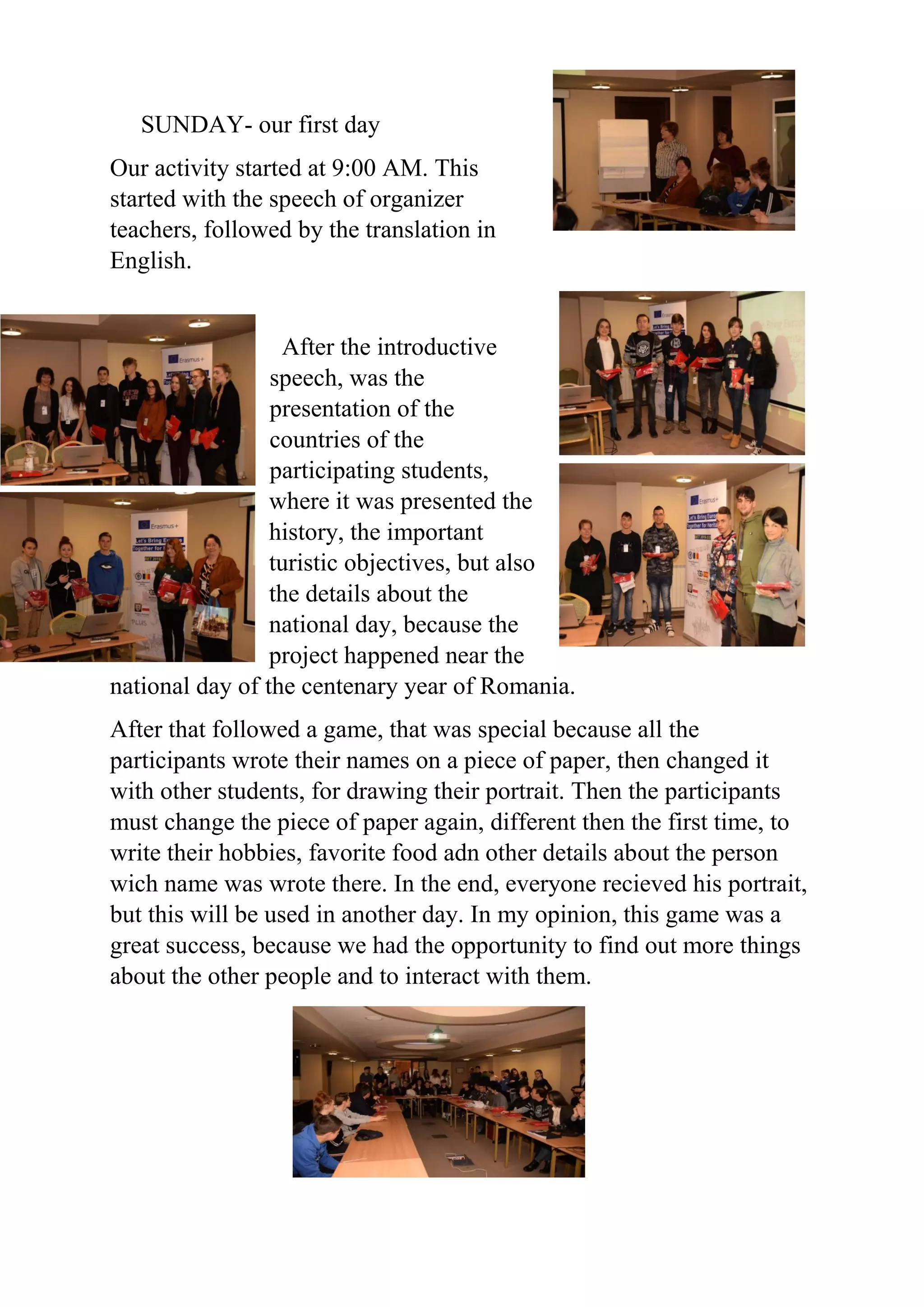 The first day of activities started at 9:00 AM with a speech from the organizers and a translation to English. Students then presented on their home countries, including history, tourist sites, and national days. An icebreaker game followed where students drew each other's portraits and wrote details about themselves on name tags to learn more about each other. The last game of the day involved teams drawing flowers with their passions written on petals and a common passion in the center, which they then presented. The day concluded with participants going home having made memories from the interactions.