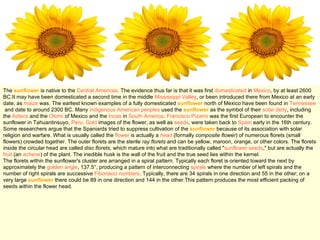 The sunflower is native to Central America and was first domesticated in Mexico by 2600 BC. It may have also been domesticated independently in Tennessee around 2300 BC. Many indigenous peoples saw the sunflower as a symbol of their solar deity. Europeans first encountered sunflowers in Peru in the 1500s. The structure of the sunflower head is made up of many small florets spiraling in a pattern related to the Fibonacci sequence, efficiently packing the seeds.