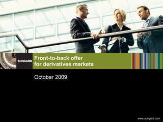 The document describes SunGard's offerings for derivatives markets, including front office trading systems, middle office post-trade processing, and back office solutions. It outlines their global presence, product lines, and integrated front-to-back workflow solutions for trading, clearing, settlement, and accounting across multiple asset classes.