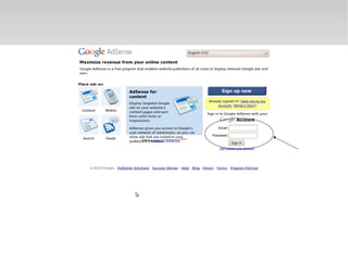 Google Adwords is Google's flagship advertising product that allows advertisers to bid on keywords or search terms and display ads when those terms are searched. Advertisers pay Google when users click these ads. Google Adsense allows website owners to display text, image, and video ads from Google's ad network on their sites and earn revenue from clicks or impressions. Both programs generate the majority of Google's profits through charging advertisers for ad placement and data collection.
