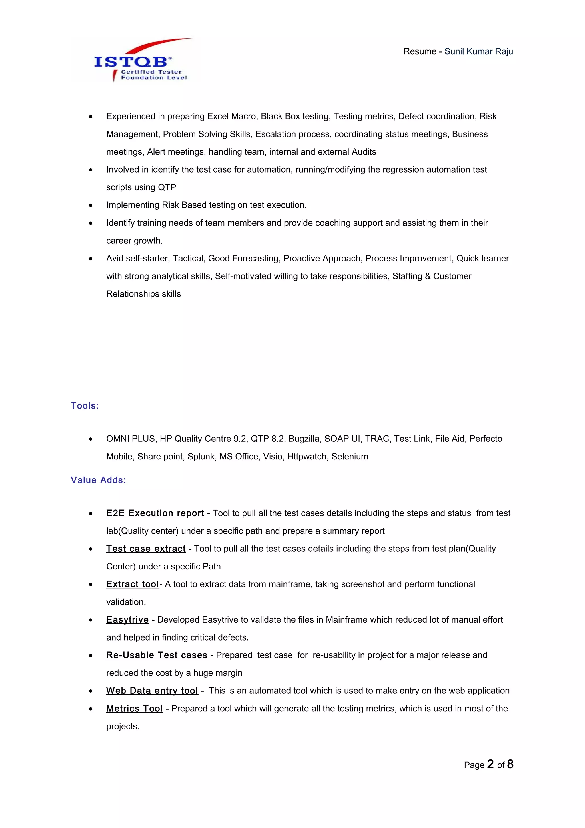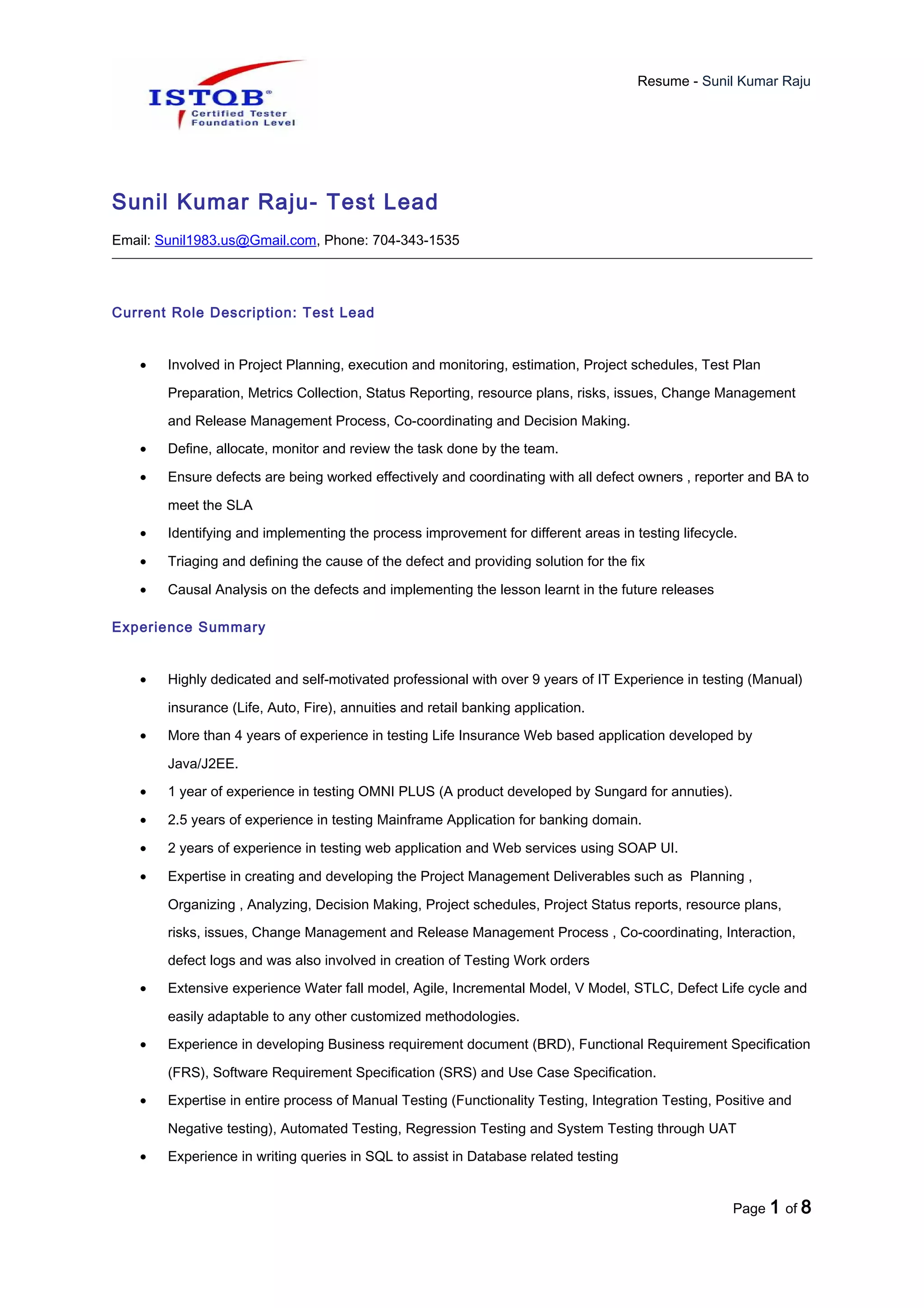 Sunil Kumar Raju has over 9 years of experience in software testing for insurance, annuities, banking, and web applications. He currently works as a Test Lead at TATA Consultancy Services where he is responsible for project planning, test case development, defect tracking, and ensuring on-time delivery. Prior experience includes roles as Test Lead at Cognizant Technology Solutions and Bank of America, where he managed teams and delivered various testing services for clients such as State Farm Insurance, Teachers Insurance and Annuity Association, and MetLife Insurance.