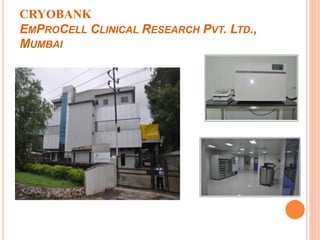 1. The document describes the facilities and procedures of Cryobank at EmProCell Clinical Research Pvt. Ltd. in Mumbai for processing and storing fetal tissue extracts and organ-specific progenitor cells.
