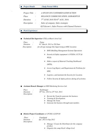 Sunit Kumar Rai's curriculum vitae summarizes his personal and professional experience. He received an MBA in marketing and HR from IITM Kanpur in 2011 and a B.Com from DDU Gorakhpur University in 2008. Currently, he works as a Technical Site Supervisor at Bharti Airtel Ltd in Patna, where he is responsible for managing site operations and security. Prior to this, he held positions as an Assistant Branch Manager at ERIS Marketing Services and as a District Project Coordinator for UPCRD in Gopalganj. He aims to build his career in a leading corporate environment where he can contribute to organizational growth.