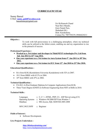 The document is a curriculum vitae for Sunny Bansal. It outlines his objective to work in a challenging environment where he can fully utilize his technical skills. It details his professional experience as a .Net trainer and developer from 2012-2014 and 2010-2011. It also lists his educational qualifications including a B.A. from KUK in 2007 and technical qualifications like a PGDC in computer applications. It outlines his technical skills in languages like C, C++, HTML, and databases. It provides links to live projects undertaken and describes dummy projects completed. Personal details like date of birth and marital status are also included.