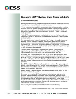 Sunoco uses its eCAT system powered by Essential Suite software to manage compliance with Title V of the Clean Air Act. eCAT tracks the hundreds of thousands of tasks required to comply with Title V permits and assigns them to individuals, improving accountability. It allows Sunoco to identify compliance requirements, communicate tasks, and track their completion, catching noncompliance early. Using eCAT has helped Sunoco reduce deviations and pass corporate audits, saving time on reporting which used to take weeks but now takes days. While initially focused on Title V, eCAT can also track requirements for health, safety, and other business areas.
