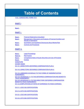 This 10-Q filing by Sunoco Inc. provides: 1) Unaudited quarterly financial statements for the periods ended September 30, 2008 and 2007 including income statements, balance sheets, and cash flow statements along with accompanying notes. 2) A discussion and analysis of Sunoco's financial condition and results of operations for the periods. 3) Disclosure of legal proceedings, risks factors, and controls and procedures.