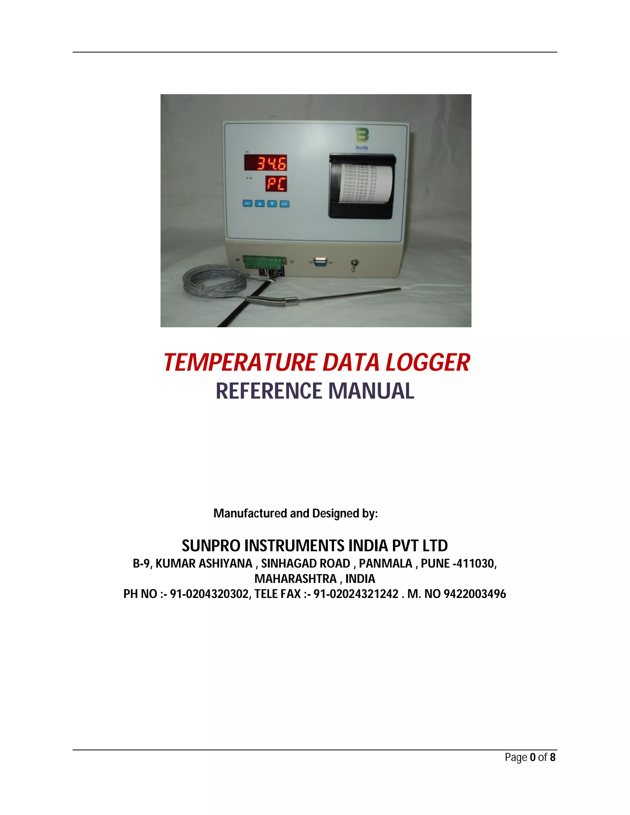 The temperature data logger by Sunpro Instruments is designed to monitor and record data from various environments, featuring high accuracy, a user-friendly software interface, and compatibility with thermal printers. It can log up to 32,000 records and allows data export to formats like Excel and WordPad for analysis. The document also includes sections on installation, hardware overview, and troubleshooting for effective usage.