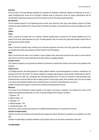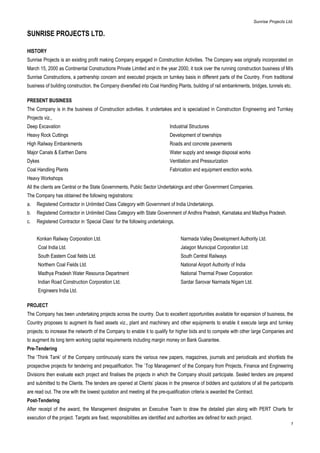 Sunrise Projects Ltd is an Indian construction company with over 20 years of experience undertaking projects across India. It specializes in construction engineering and turnkey projects like excavation, bridges, tunnels, industrial structures and more. The company aims to augment its assets, net worth, and working capital to enable it to bid for larger projects and compete with larger companies. It has over 1500 employees and qualifications to bid for major infrastructure projects from the government and public sector.