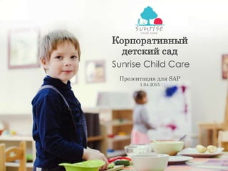 Документ представляет собой презентацию корпоративного детского сада Sunrise Child Care, который предлагает программы развития для детей от 3 до 6 лет на основе метода Монтессори. Организация ориентируется на сотрудничество с компаниями для поддержки work-life balance сотрудников, обеспечивая адаптивное и экологичное образовательное пространство. Sunrise Child Care активно использует уникальные подходы к обучению и взаимодействию с семьями, стремясь создать гармоничную среду для воспитания детей.