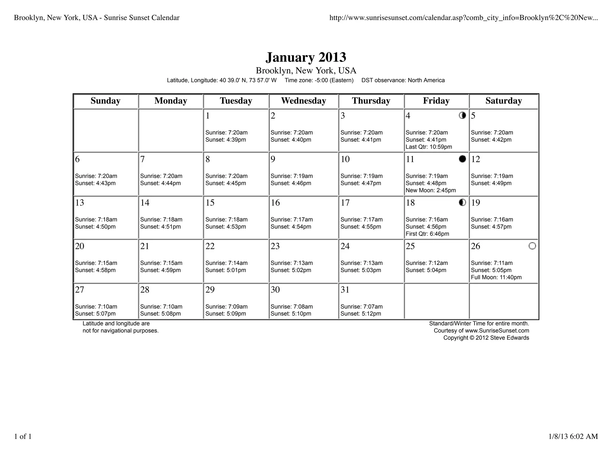 This document is a sunrise/sunset calendar for Brooklyn, New York for January 2013. It lists the dates, days of the week, sunrise and sunset times for each day. Key lunar dates are also noted, including the last quarter moon on January 1st, the new moon on January 12th, the first quarter moon on January 19th, and the full moon on January 26th.