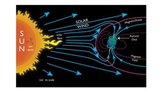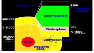 The document describes the different layers of the Sun from the photosphere to the corona. The photosphere is the deepest layer at 250 miles thick and ranges from 6500K to 4000K in temperature. Above is the chromosphere ranging from 250 to 1300 miles and 4000K to 8000K. The narrow transition region between the chromosphere and corona ranges from 8000K to 500,000K. The outer corona extends 1300 miles and reaches temperatures over 500,000K. Various solar phenomena like granules, faculae, sunspots, auroras, and prominences are also mentioned.