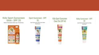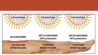 This document provides information about sunscreen, including its history, types of UV rays, sunscreen classifications, SPF ratings, and key ingredients. Ancient Egyptians used plant extracts for rudimentary sun protection. There are three types of UV rays: UVA causes aging, UVA causes sunburn and contributes to skin cancer, and UVC is blocked by the atmosphere. Sunscreens can be physical or chemical, with physical using ingredients like zinc oxide to scatter rays and chemical using ingredients like PABA to absorb rays. SPF ratings measure UVB ray protection, with higher SPF blocking more rays. Ingredients include avobenzoates, cinnamic acid derivatives, and salicylates. An ideal