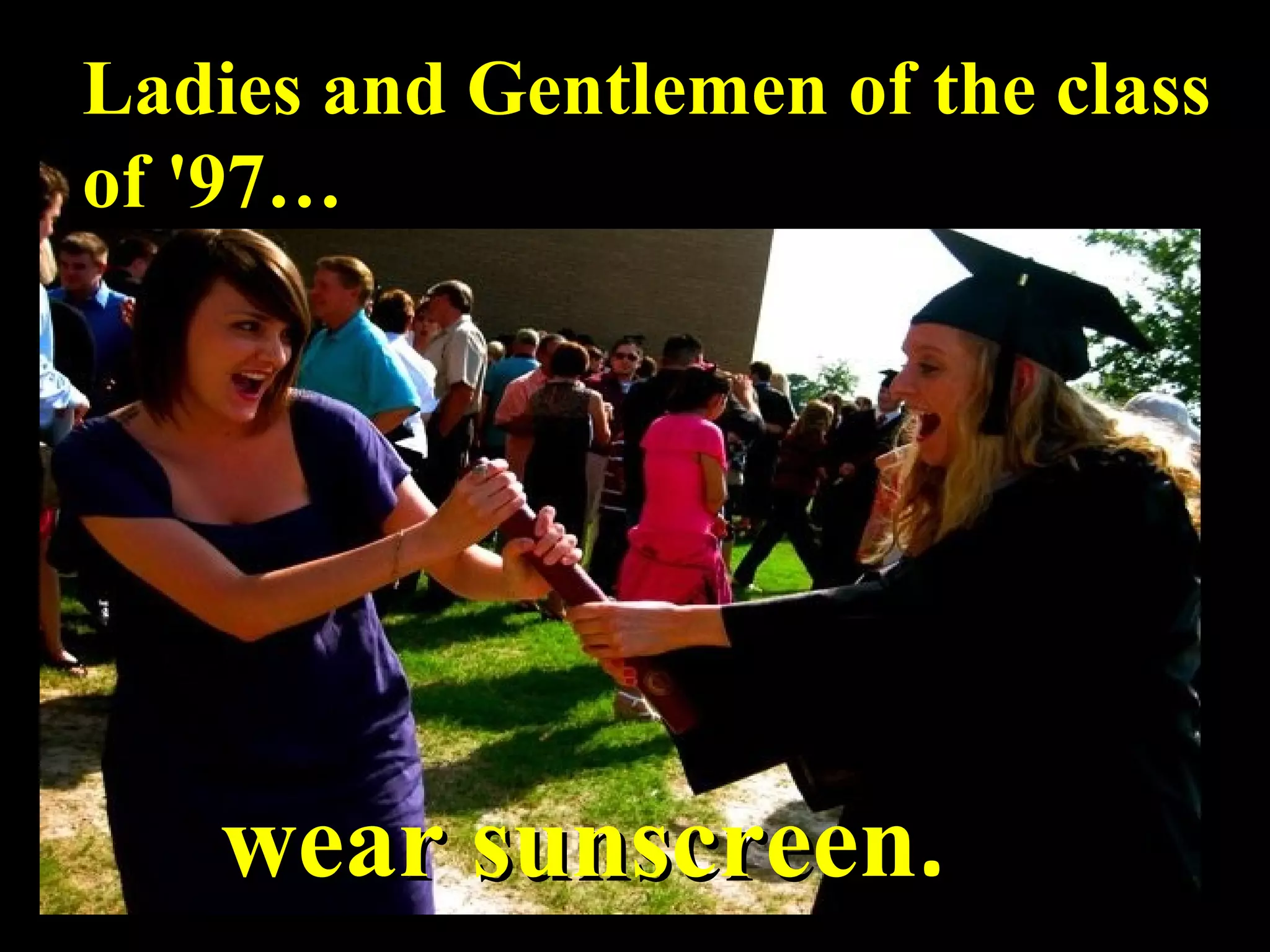 The document provides a collection of advice for graduates from the class of 1997. It emphasizes wearing sunscreen to protect skin from damage. It also encourages enjoying youth, doing something scary daily, being kind to others, and traveling. The advice stresses living life without regret and making the most of the present time while it lasts.