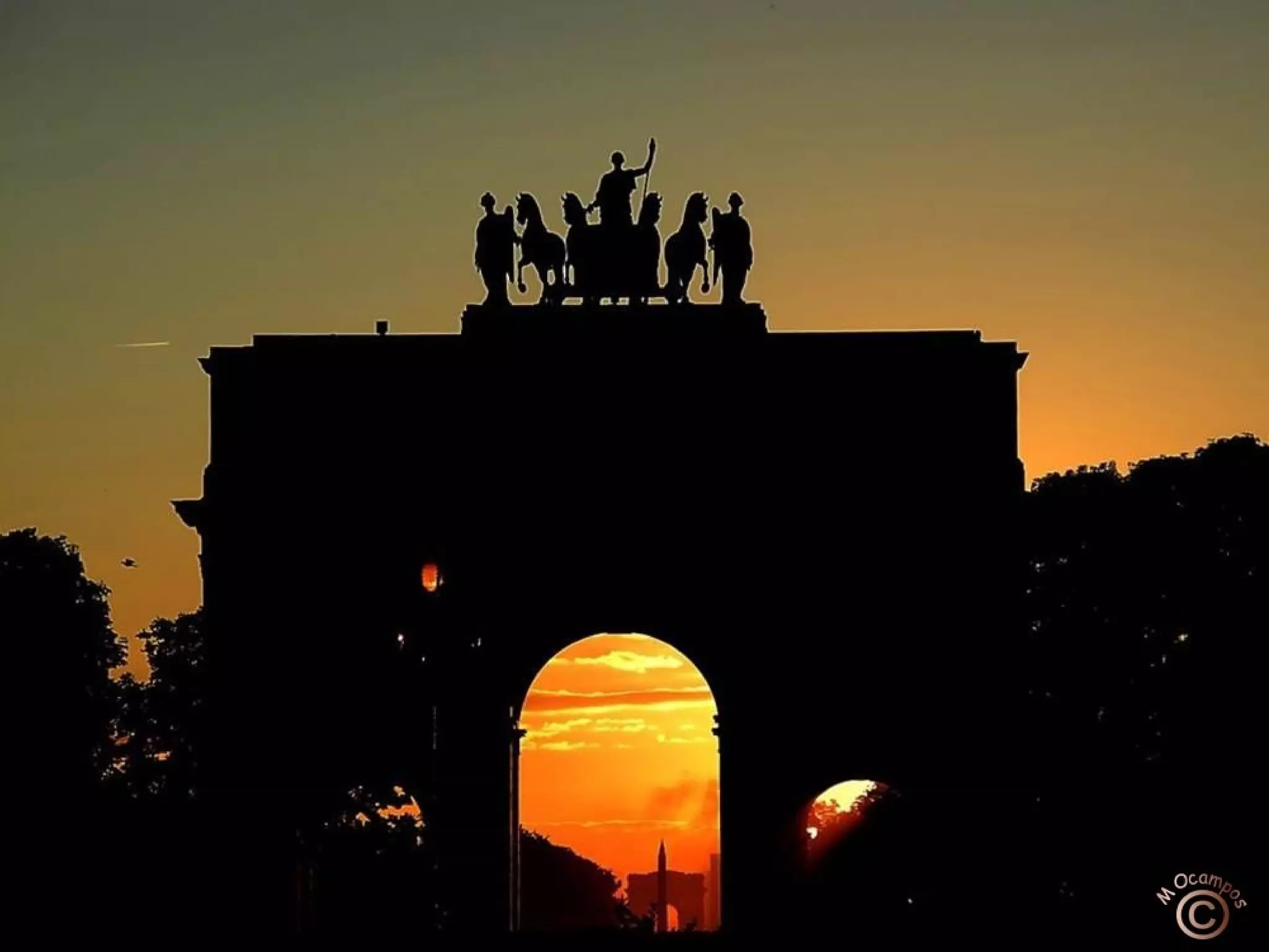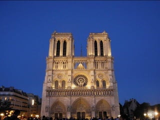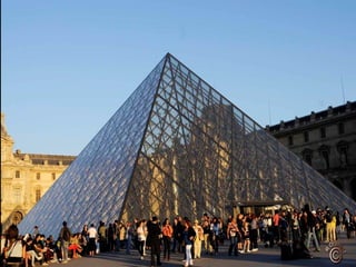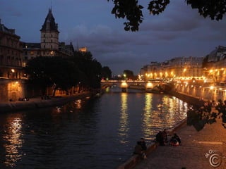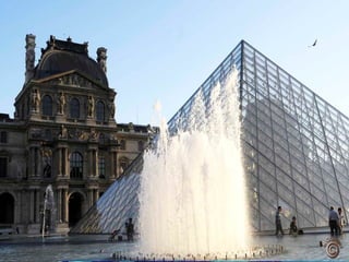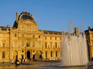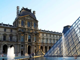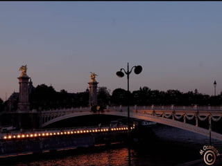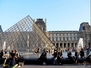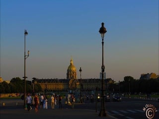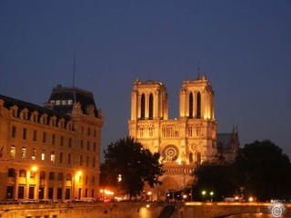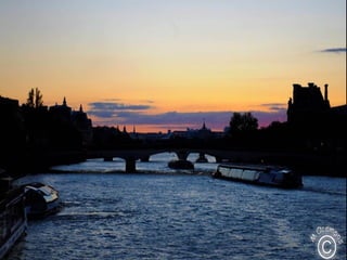 The document provides views of several famous landmarks in Paris including the Pyramide and Louvre Museum, Notre Dame Cathedral located on the Seine River, the Petit Palais Museum, Pont Neuf bridge, the Eiffel Tower in the distance, and the Latin Quarter neighborhood. Locations mentioned include the Bridge of Arts, the Samaritaine building, île de Saint Louis island, Boulevard Saint Michel, the Abbey of Saint-Germain-des-Prés, Alexandre III Bridge, and the Hôtel des Invalides.