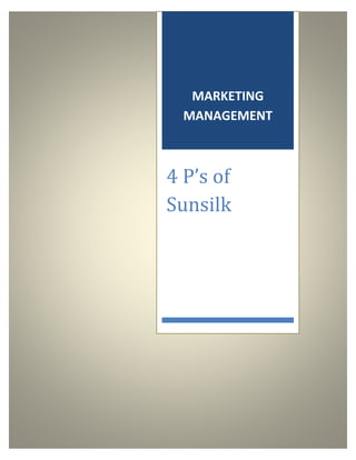 This document discusses the 4 P's of marketing strategy for Sunsilk shampoo in India. It provides details on the product range, pricing, promotion, and distribution strategies. Sunsilk offers various shampoo variants targeted at different hair needs that were co-created with 7 global hair experts. It uses value-based pricing and promotional campaigns involving celebrity endorsements. Hindustan Unilever distributes Sunsilk widely in India through a network of distributors and retailers to achieve a broad reach across urban and rural areas.
