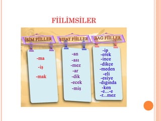 mastar eklerini (-mek, -mak) alır, kip eklerini alır. Fiilimsiler