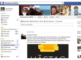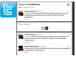 The document discusses the concept of metaliteracy, emphasizing its role in transforming information literacy across disciplines and fostering critical thinking and collaboration in a digital age. It highlights the need for revised educational objectives that integrate technology and participatory learning methods, informed by research and feedback from both educators and students. The authors aim to develop robust collaborations between librarians and faculty to create and implement effective metaliteracy learning initiatives.