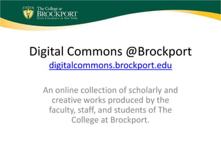 The document outlines the development of the Brockport model for an institutional repository at The College at Brockport, aiming to create a comprehensive collection of scholarly works. It emphasizes administrative support, faculty engagement, and the creation of signature collections to promote usage and visibility. Future steps include maintaining buy-in from stakeholders and continuing to develop the repository's unique offerings.