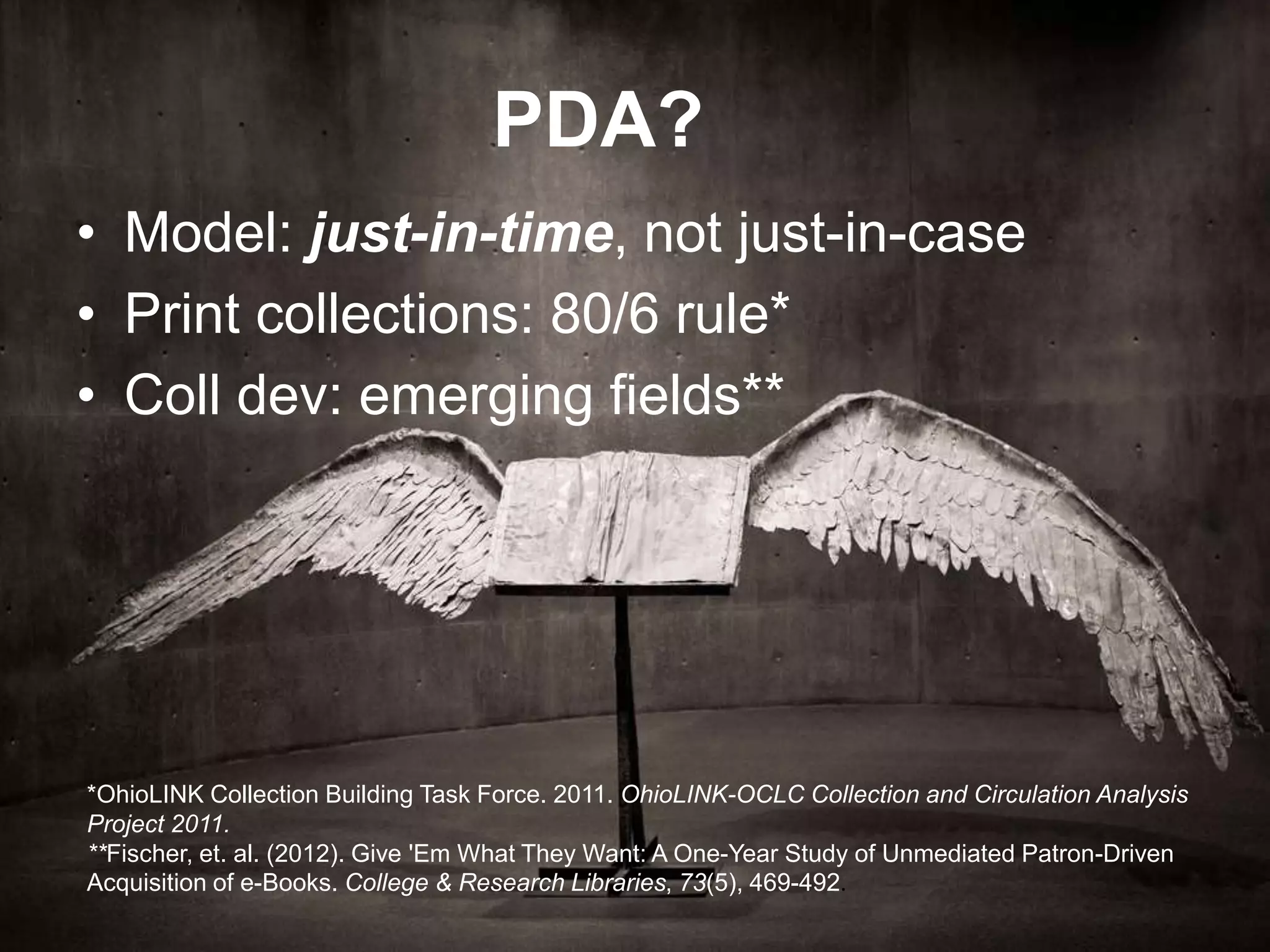 This document summarizes the results of a patron-driven ebook acquisition program at SUNY Empire State College. Through the program, 81,516 ebooks were made available through a short-term loan system. Over the first 18 months, there were 2,670 triggers which resulted in $54,735 spent on 90 purchased titles. On average, each trigger cost $19.69. The program led to a 33% increase in the size of the ebook collection and may have decreased interlibrary loan requests. User behavior data showed that most triggers were from viewing portions of ebooks, rather than downloading or printing.