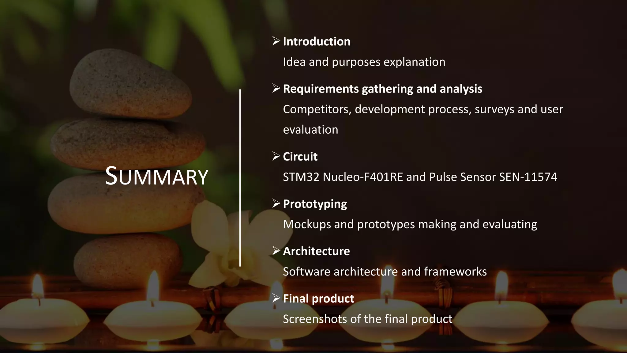 The Suomi project aims to reduce stress levels by transforming traditional spas into smart environments through the use of microcontrollers and machine learning. It incorporates user feedback and surveys to create a guide that enhances spa experiences and ensures user safety by providing tailored wellness suggestions based on individual health data. The project's architecture is built on Microsoft .NET and is designed to connect with IoT devices to improve user interaction and relaxation during spa visits.