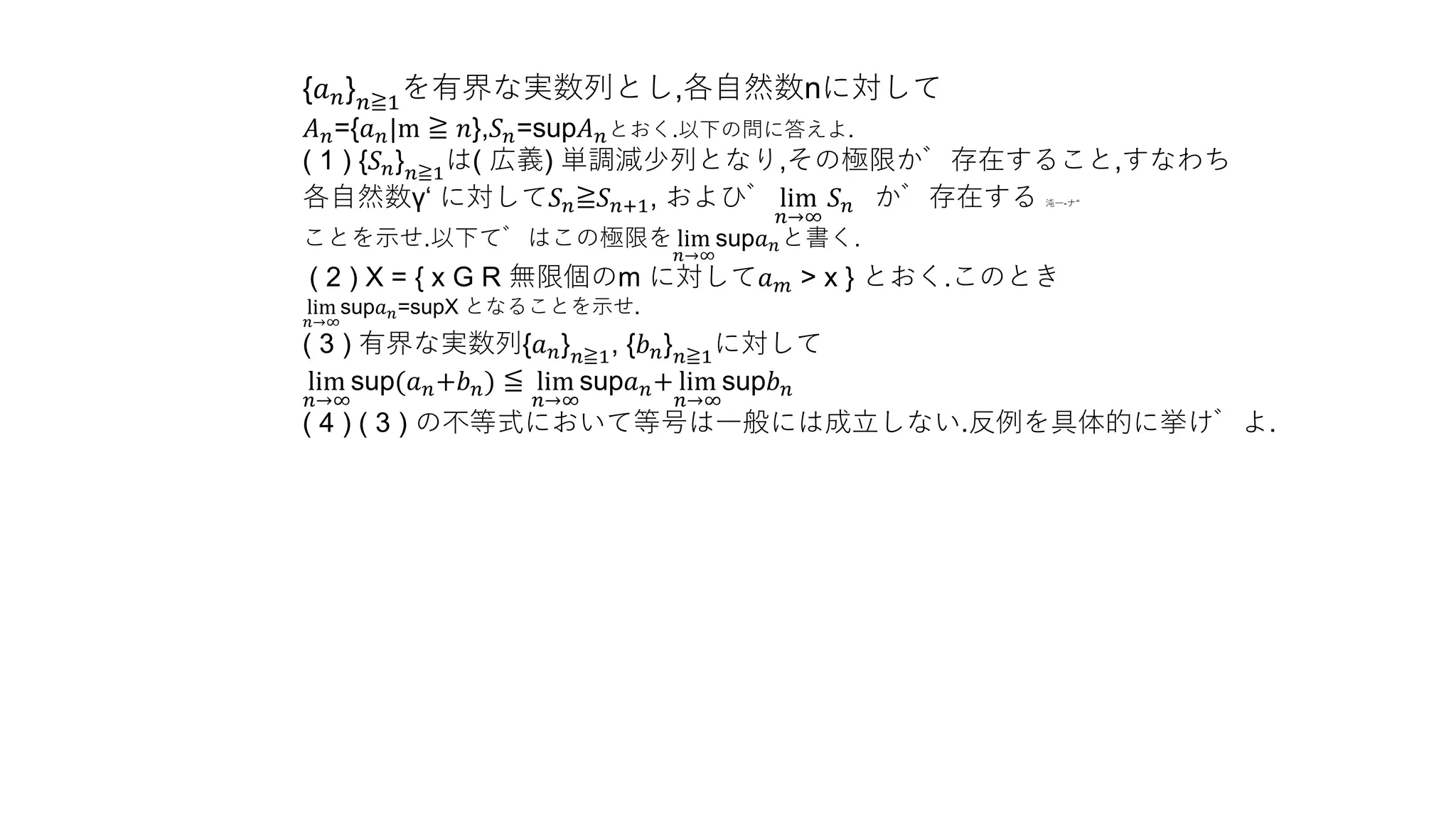 𝐴𝑛={𝑎 𝑛|m ≧ 𝑛},𝑆 𝑛=sup𝐴 𝑛とおく.以下の問に答えよ.