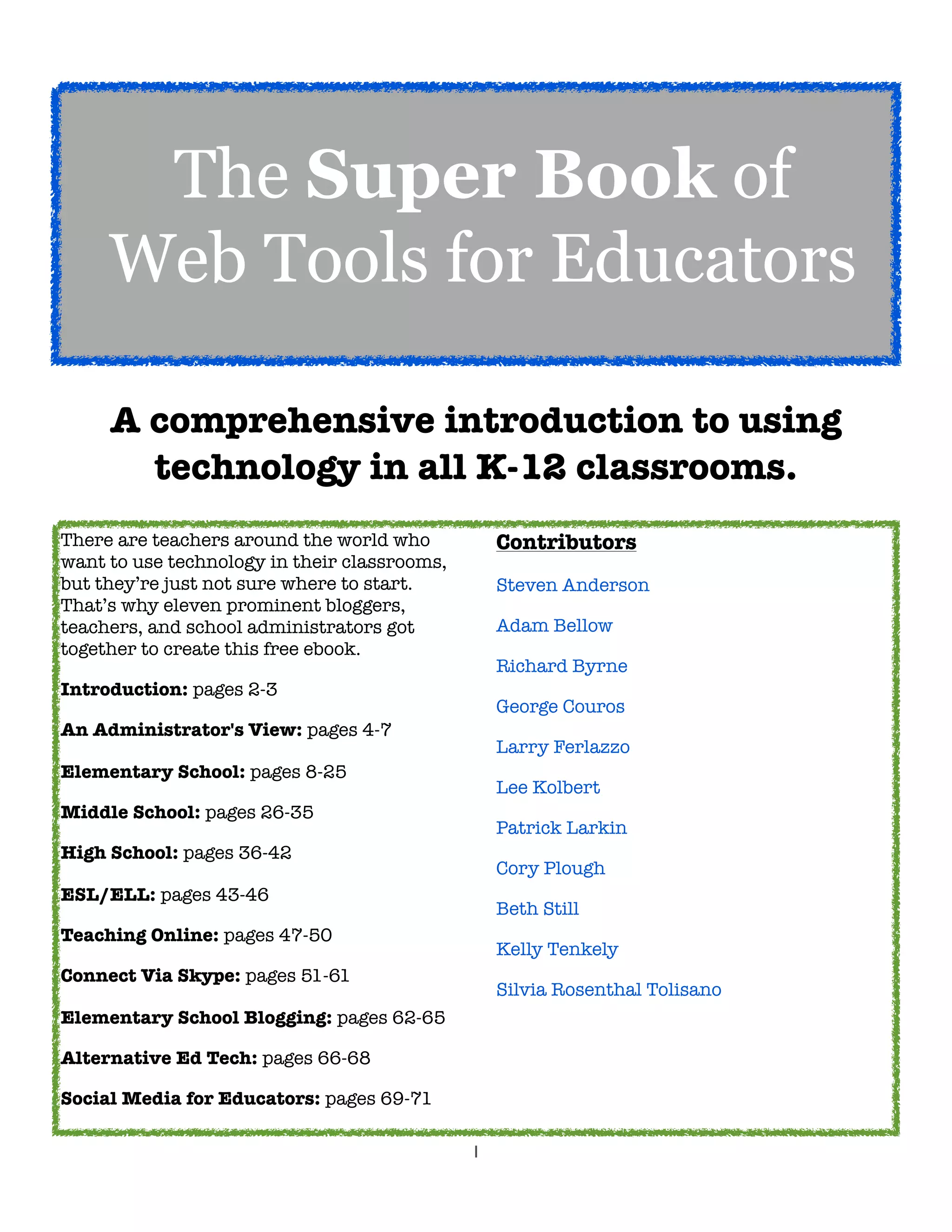 The document provides an overview of web tools that can be used in K-12 classrooms. It includes contributions from 11 educators and is divided into sections for different grade levels and subject areas. The elementary school section highlights several web tools that are well-suited for elementary classrooms, noting whether each tool is for students age 13 and under or older due to privacy regulations. Specific ideas for how teachers can use each tool in the classroom are also provided.