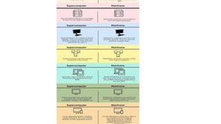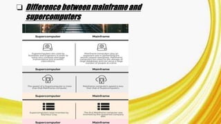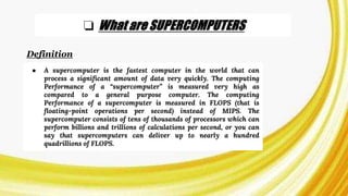Supercomputers are the most powerful computers in the world capable of performing trillions of calculations per second. They use parallel processing, which splits problems into pieces to be solved simultaneously by thousands of processors. While early supercomputers were single, massive machines, modern supercomputers often consist of clusters of networked computers working together. Supercomputers are used for advanced scientific and engineering applications like weather modeling, nuclear research, and animations that regular computers cannot handle due to their immense processing power needs.