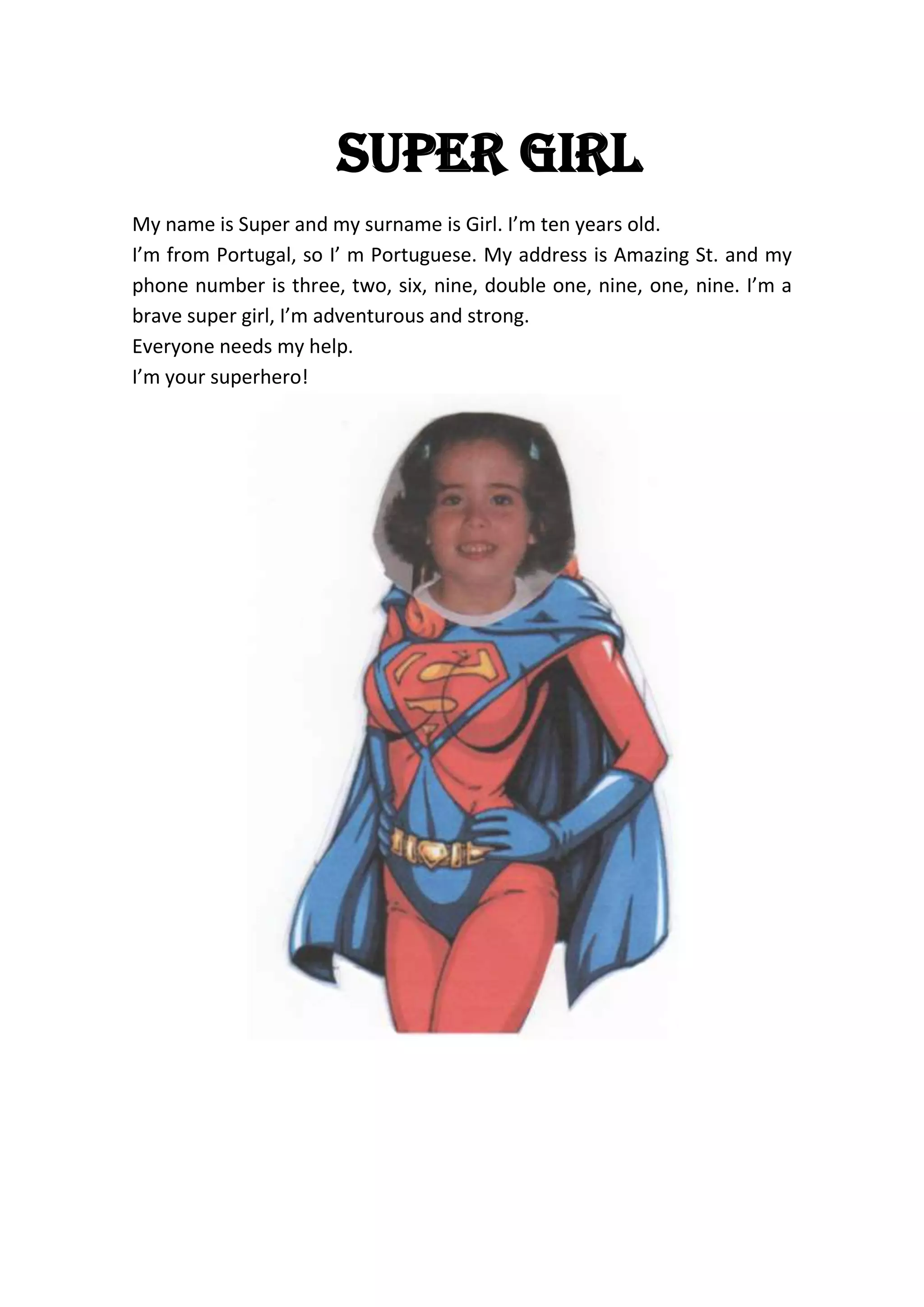 Super Girl<br />Myname is Super and my surname is Girl. I’m ten years old.<br />I’m from Portugal, so I’ m Portuguese. My address is Amazing St. and my phone number is three, two, six, nine, double one, nine, one, nine. I’m a brave super girl, I’m adventurous and strong.<br />Everyone needs my help.<br />I’m your superhero!<br />