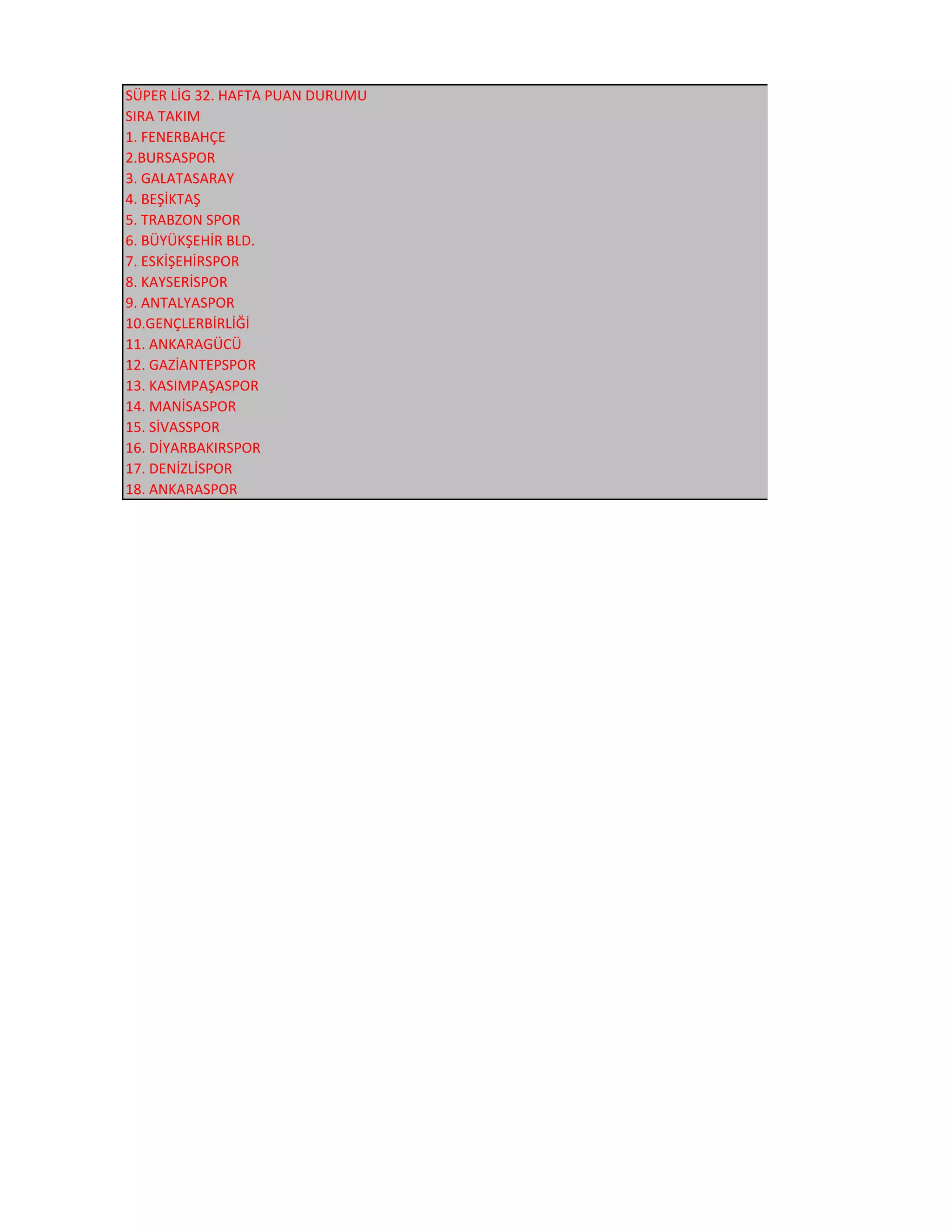HAFTA PUAN DURUMU SIRA TAKIM 1. FENERBAHÇE 2.BURSASPOR 3. GALATASARAY 4. BEŞİKTAŞ 5. TRABZON SPOR 6. BÜYÜKŞEHİR BLD. 7. ESKİŞEHİRSPOR 8. KAYSERİSPOR 9. ANTALYASPOR 10.GENÇLERBİRLİĞİ 11. ANKARAGÜCÜ 12. GAZİANTEPSPOR 13. KASIMPAŞASPOR 14. MANİSASPOR 15. SİVASSPOR 16. DİYARBAKIRSPOR 17. DENİZLİSPOR 18. ANKARASPOR
