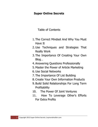 This document provides guidance on creating a successful online business through blogging and other internet marketing techniques. It discusses 11 key points: 1) Developing the correct mindset and understanding necessary skills; 2) Using proven techniques like blogging, article writing and email marketing; 3) Creating your own blog to build an audience and share knowledge; 4) Answering customer questions professionally; 5) Mastering article marketing; 6) Using social networks; 7) Importance of list building; 8) Creating your own information products; 9) Building relationships for long-term profitability; 10) Leveraging joint ventures; 11) Leveraging others' efforts for extra profits. It emphasizes focusing on proven basics rather than latest trends