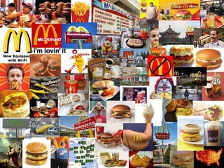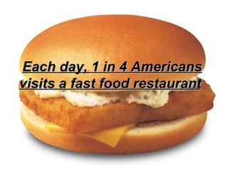 The document discusses statistics related to fast food consumption and obesity in America, noting that 1 in 4 Americans visits fast food daily, spending over $110 billion annually, and 60% of Americans are now overweight or obese, which experts link to heavy fast food intake, pervasive fast food advertising seen by children, and fast food's high sugar content.