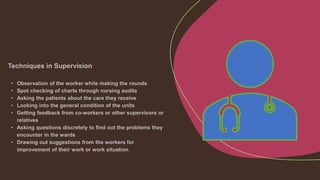 Supervision involves overseeing the work of others and ensuring it is performed appropriately. The main goals of supervision are to deliver high quality healthcare services, help staff reach their highest potential, and evaluate performance to improve outcomes. A good supervisor exhibits qualities like thoroughness, fairness, initiative, tact, and emotional control. Effective supervision utilizes various techniques such as direct observation, group discussions, orientation, and evaluation to guide, teach, and support staff. Principles of good supervision include respecting individuals, fostering independent thinking, creating a supportive learning environment, and stimulating continuous self-improvement.