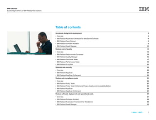 The document outlines IBM's software solutions for optimizing WebSphere solutions, emphasizing the integration of various IBM Rational tools to accelerate software design, development, and delivery while improving web security and reducing costs. It highlights capabilities of tools like IBM Rational Application Developer, Rational Team Concert, and Rational Software Architect which facilitate agile practices and enhance collaboration among distributed teams. Furthermore, it discusses asset management strategies to manage and reuse development assets effectively within enterprise software development.