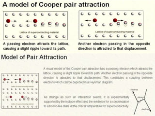 3. The BCS theory developed by Bardeen, Cooper, and Schrieffer in 1957 explains superconductivity as arising from electrons forming pairs (Cooper pairs) that condense into the same quantum state. This pairing is mediated by lattice vibrations