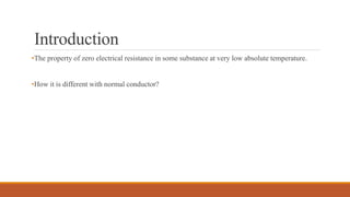 - Superconductivity occurs when some materials experience zero electrical resistance below a certain temperature. Key discoveries include superconductivity being discovered in 1911, the Meissner effect in 1933, and the BCS theory in 1957 which explained superconductivity in terms of Cooper pairs.