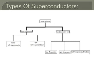 This document summarizes an active learning assignment on the topic of superconductors. It discusses three main types of superconductors: Type 1, which exhibit the Meissner effect and have low critical magnetic fields; Type 2, which behave differently in increasing magnetic fields and are used for most engineering applications; and classifications based on the coolant (low-temperature using liquid helium, and high-temperature above liquid nitrogen). Applications discussed include magnetic levitation, Josephson junction devices like SQUIDs, power transmission, MRI machines, magnetic field generation, and cryotrons for fast and efficient computing.