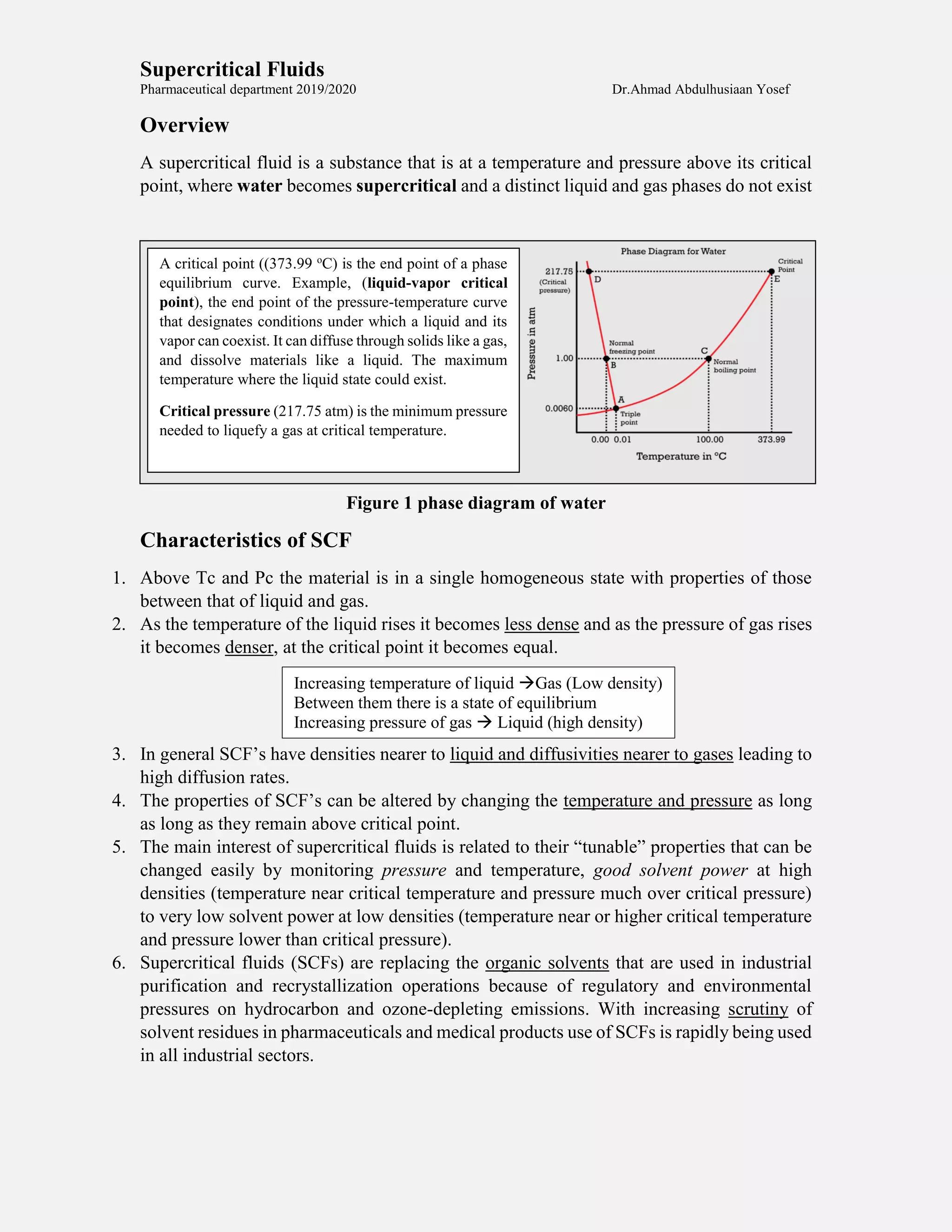 Supercritical fluids are substances above their critical point where distinct liquid and gas phases do not exist. They have densities nearer to liquids and diffusivities nearer to gases. Their properties can be tuned by adjusting pressure and temperature. Supercritical fluids like carbon dioxide are replacing organic solvents in industrial purification due to their environmental benefits. They are used in extraction, particle formation, and drug delivery due to their ability to dissolve materials like liquids while diffusing through solids like gases.