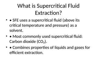 Supercritical Fluid Extraction (SFE) utilizes supercritical carbon dioxide as a solvent for efficient and selective extraction of compounds. It is eco-friendly, offers high extraction rates, and allows the recycling of solvents, making it advantageous for use in food, pharmaceuticals, cosmetics, and environmental science. However, the initial setup cost can be high and its effectiveness may be limited for polar compounds.