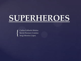 The document describes several popular superheroes including Superman, who has super speed and strength, Batman, who lacks powers but is very intelligent and athletic, Spider-Man, who can cling to walls and has a spider-sense, Green Lantern whose power ring allows him to generate effects limited only by imagination, the Incredible Hulk who gets stronger when angry, and Wolverine who can regenerate from any wound.