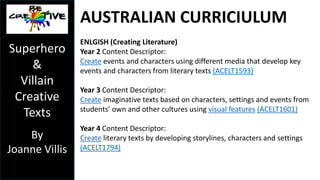 The document outlines a creative curriculum unit by S. Joanne Villis focused on superhero and villain themes for different year levels in Australian schools, incorporating media arts and English objectives. It includes lesson plans to engage students in character creation, drawing, storytelling, and utilizing technology to present their work. Additionally, it provides resources for teachers to enhance students' understanding of heroes and villains through various creative activities.