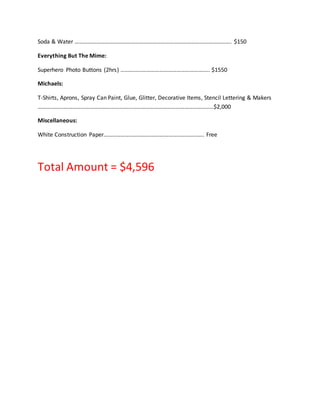 This document provides a list of expenses for a community service event called Budget Superheroes Week. It outlines purchases from various stores including costumes, supplies, food, gifts and services. The total amount spent was $4,596. Key items include Captain America and Wonder Woman costumes, candy, sharpies, gift cards, plaques, pizza to feed 350 people, photo buttons, t-shirts, and art supplies.