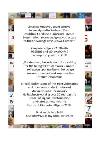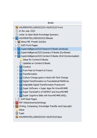 This document discusses Friedel Jonker's website and outlines requirements for the Superintelligence2525 project. It recommends using various apps and software like Scrivener, Fences, NextOS, TheBrain, Flip PDF Reader, and Dropbox across Windows, Mac, iPad, and iPhone devices to organize your desktop, use an AI assistant, contextualize thoughts, and achieve peak performance as part of the KnowMO4Me High Performance Worksystem architecture.