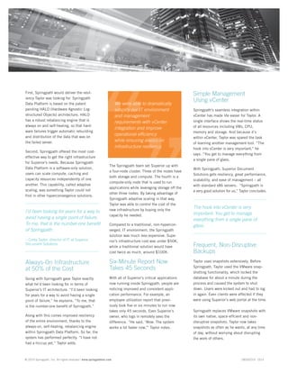 Superior Document Solutions implemented the Springpath data platform to enhance its IT infrastructure, achieving 8x performance improvements and a 50% reduction in costs compared to traditional architectures. The solution provides always-on resilience, adaptive scaling, and non-disruptive backups, addressing the company's critical need for reliability across its business services. Corey Taylor, the director of IT, reported significant improvements in application performance, management, and overall efficiency since deploying the hyperconverged solution.