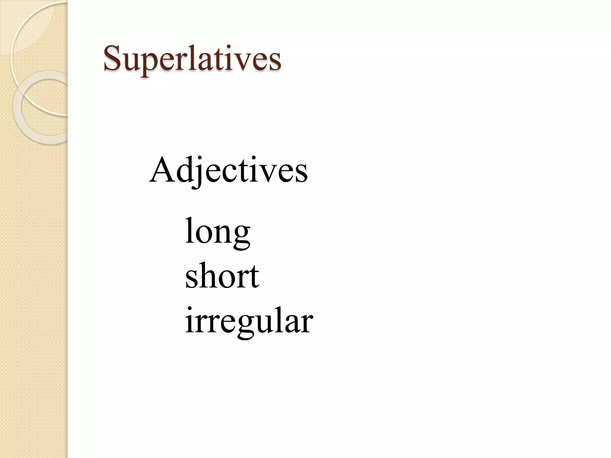 The document discusses superlative adjectives and provides examples of their use to describe the Nile River. It lists short adjectives that use -est and long adjectives that use most/most when making comparisons. It also includes links to websites that contain exercises on comparative and superlative adjectives.