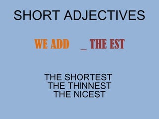 Superlatives are used with adjectives to indicate that someone or something has the highest degree of a quality. For short adjectives, "the est" is added to form the superlative, while for long adjectives "the most" is added. Examples are given of using superlatives like "the shortest", "the thinnest", "the most beautiful", and "the most expensive" to describe people and things in the highest, most extreme sense.