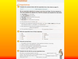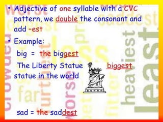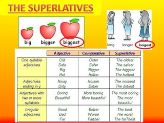 The document discusses rules for forming the comparative and superlative forms of adjectives in English. For adjectives with one syllable ending in a consonant, the comparative is formed by adding -er and the superlative is formed by adding -est. For adjectives of two or more syllables, the comparative is formed by placing "more" in front and the superlative is formed by placing "most" in front. Some common irregular adjectives have unique comparative and superlative forms like "good", "bad", and "little".