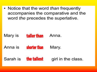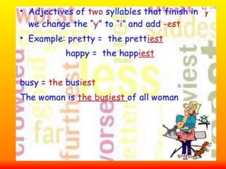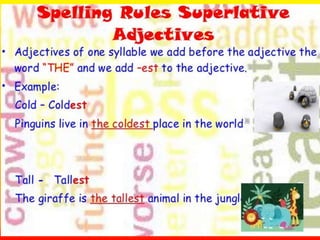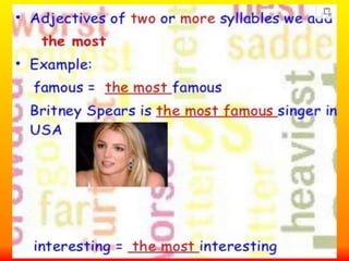 This document provides a table comparing adjectives in their positive, comparative, and superlative forms. It shows that one-syllable adjectives form the superlative with "the most" plus the adjective, while longer adjectives simply add "-est" to form the superlative.