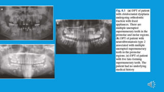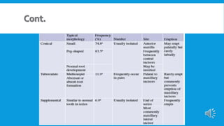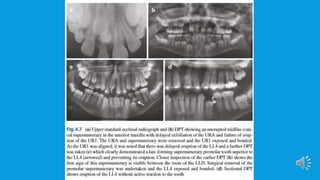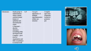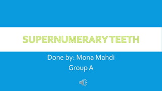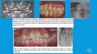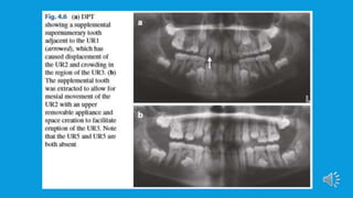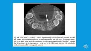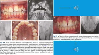 Supernumerary teeth are additional teeth that can develop in various locations in the dental arch, often leading to complications that may require removal. They are most commonly found in the permanent dentition and can occur in conjunction with syndromes, particularly in males. Management involves careful examination and imaging to determine the need for intervention, with treatment options based on the teeth's type, position, and effect on surrounding teeth.