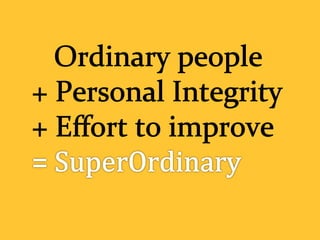 The document discusses how to become "superordinary" rather than extraordinary through integrity, intelligence, and energy. It argues one can be superordinary by asking forgiveness when lacking integrity, making personal commitments, and raising your own standards first. Several quotes are provided about the importance of integrity, forgiveness, commitments, and leading by example. The overall message is that strong yet ordinary leadership is achievable through maintaining integrity and inspiring others.